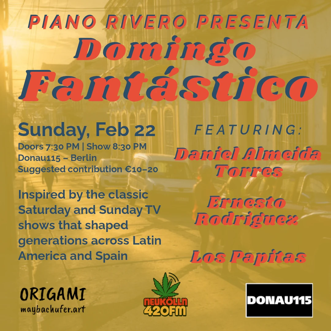 Me complace presentar una nueva edición de Domingo Fantástico, el ciclo de música y variedades que tiene lugar en Donau115. En esta ocasión, la noche estará dedicada a Cuba, celebrando la riqueza musical y cultural de la isla y su profunda influencia en la música latinoamericana y mundial.